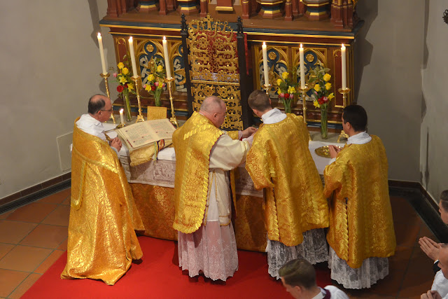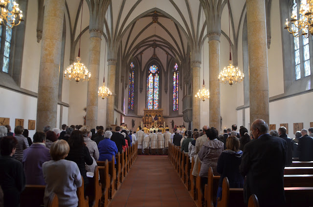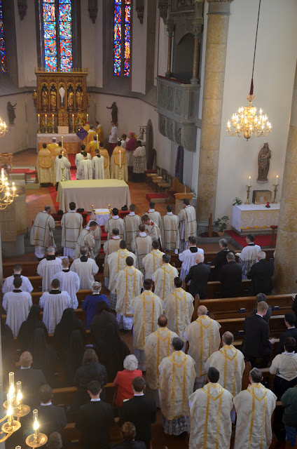 Ce jeudi matin, nous étions dans la cathédrale de Vaduz au Liechtenstein, pour la messe chrismale célébrée dans la forme extraordinaire par Mgr Wolfgang Haas, archevêque du diocèse. Les prêtres et séminaristes de Wigratzbad ont prêté main forte au clergé local, pour la majestueuse cérémonie de consécration des saintes huiles. Pour l'occasion, le pontife est assisté de douze prêtres, sept diacres et six sous-diacres.