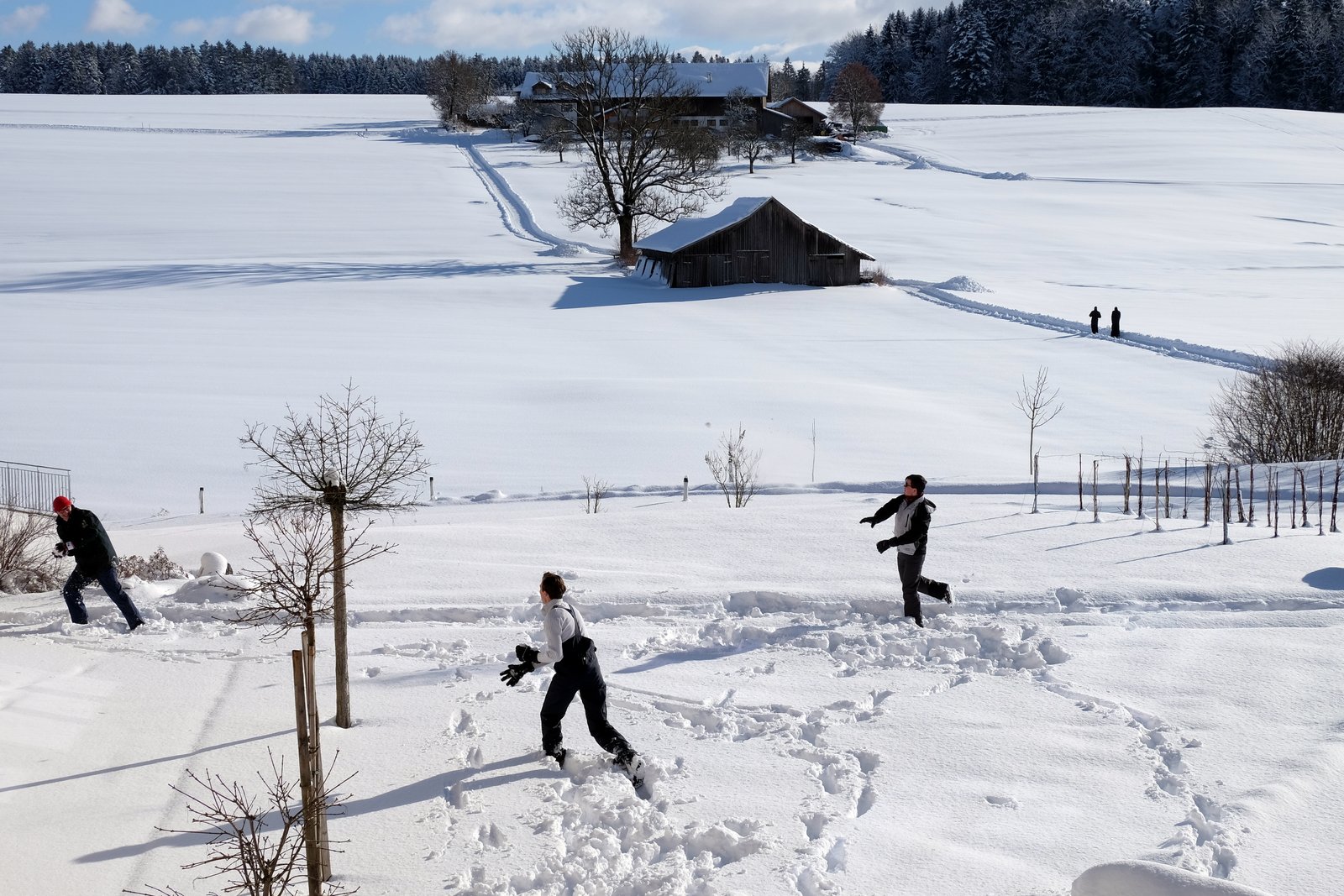 Enchantés par l'abondance des flocons, les séminaristes profitent diversement du tapis blanc... Calme promenade pour les uns, bataille acharnée pour les autres, sous l'oeil bienveillant du bonhomme de neige érigé par les séminaristes de première année.