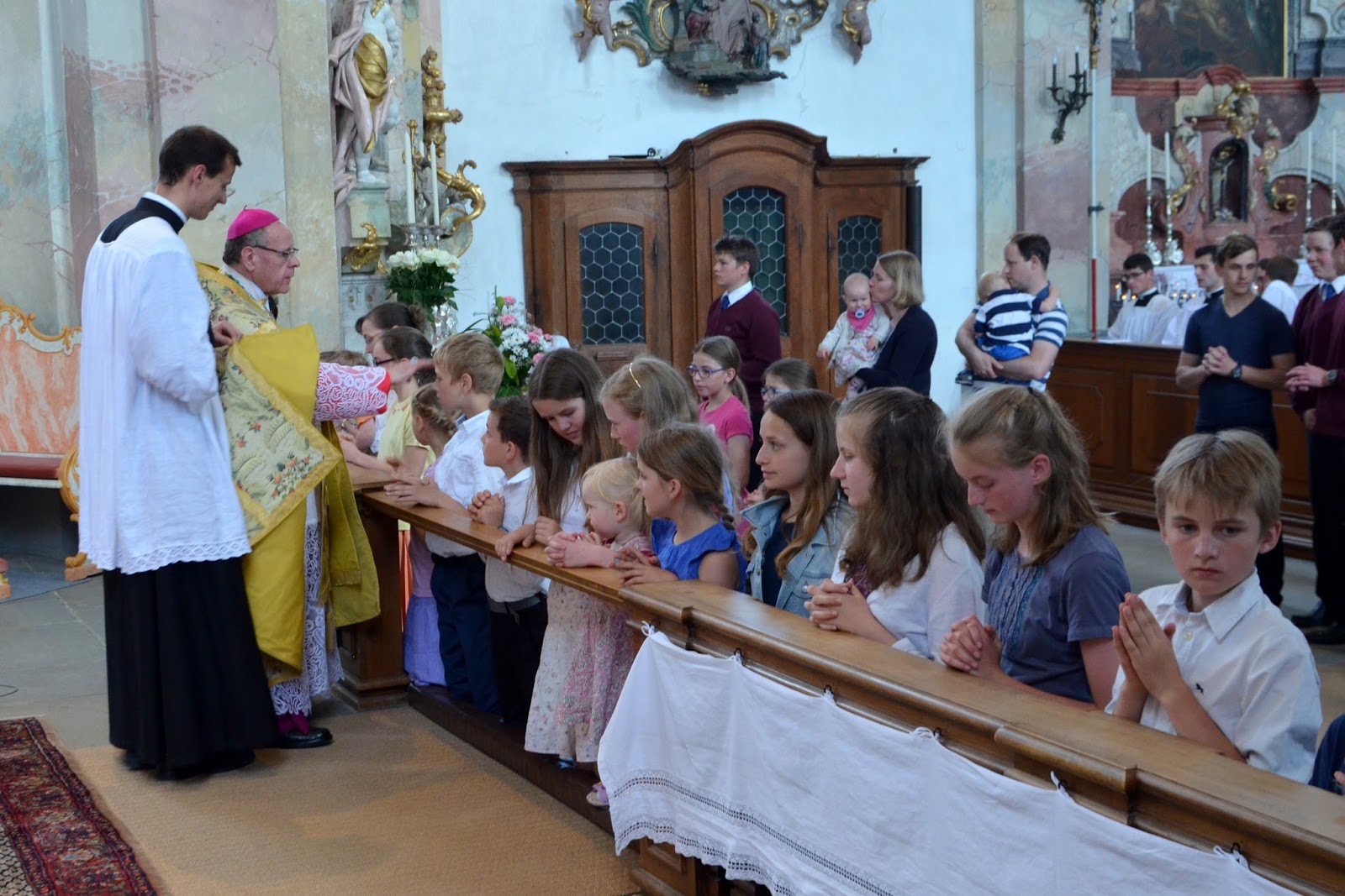 Après un copieux goûter, une "Maiandacht" nous a réunis en fin d'après-midi autour de Mgr Huonder, pour honorer la Très Sainte Vierge Marie, dont la statue du 15e siècle trône au-dessus de l'autel. Cette belle journée s'est achevée avec la bénédiction des enfants.