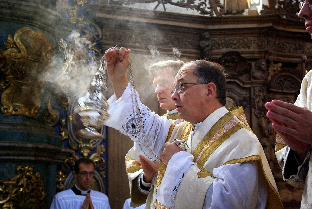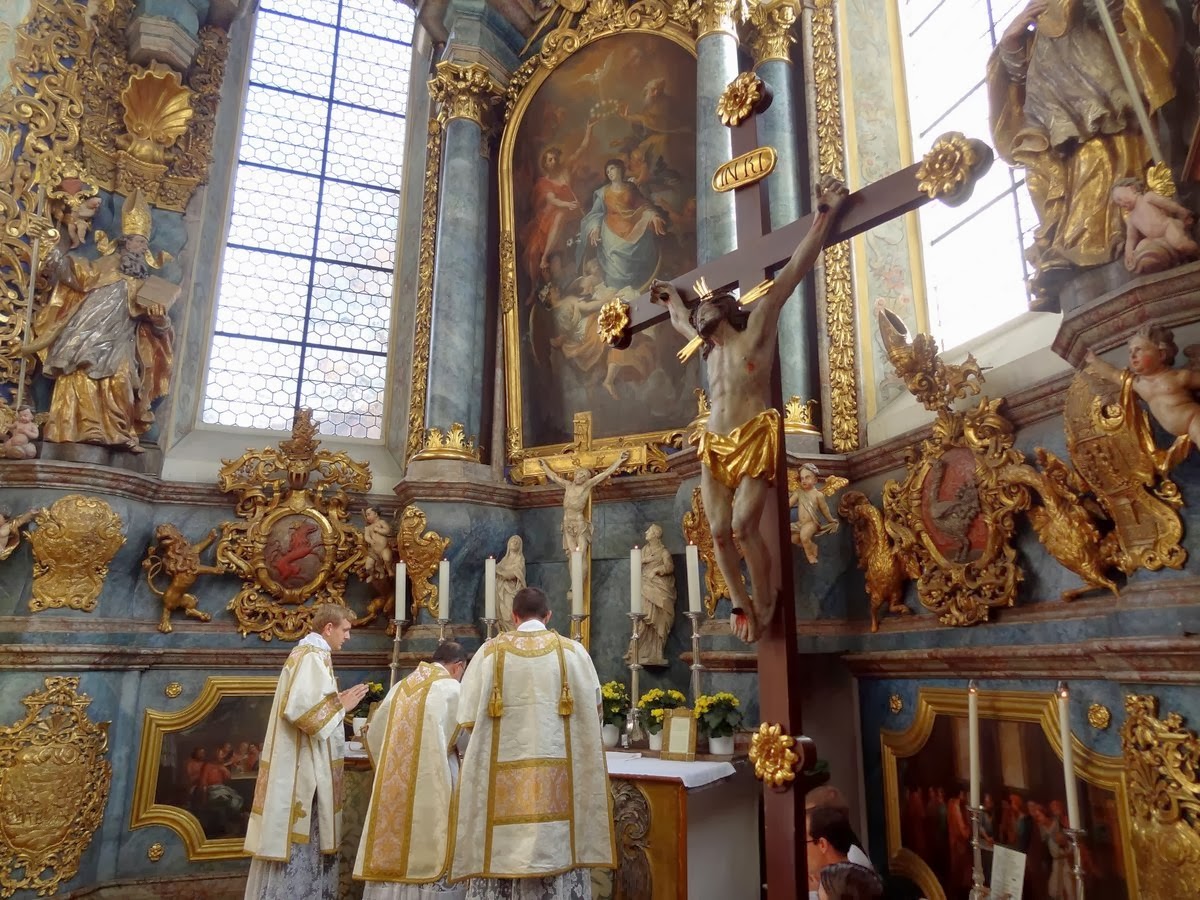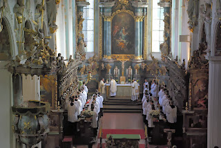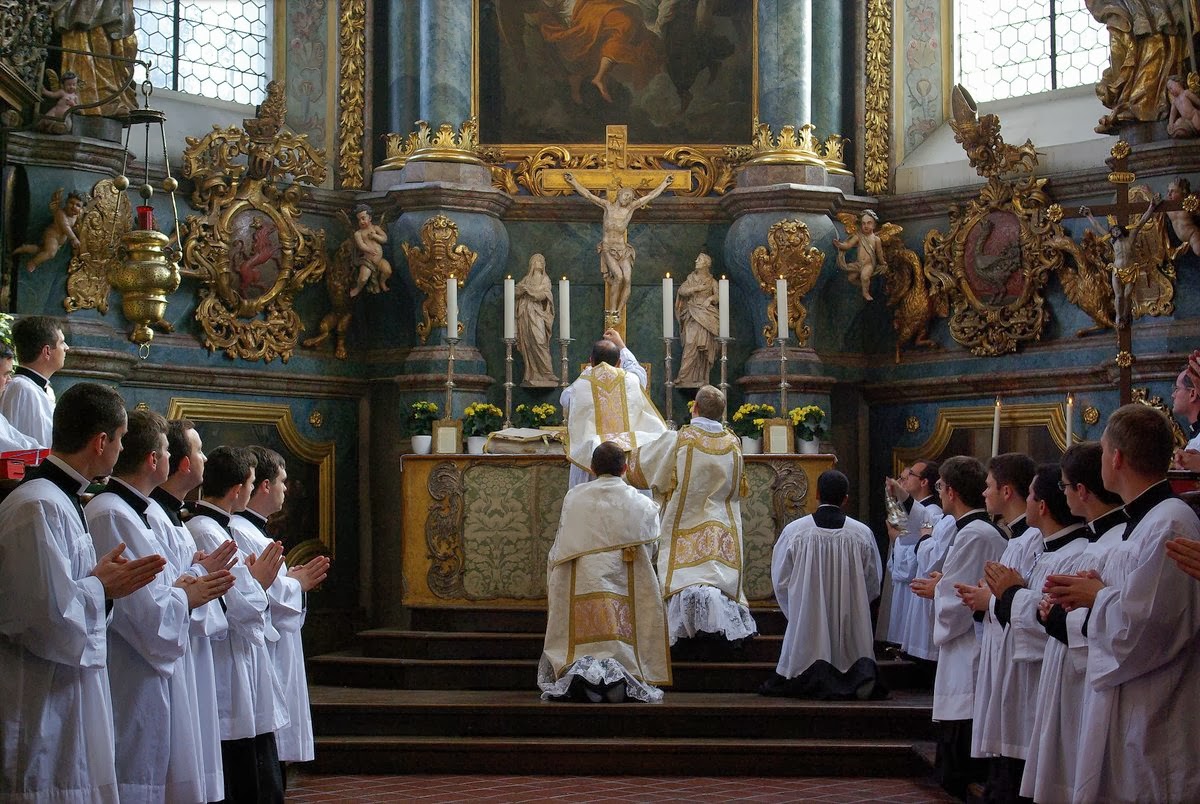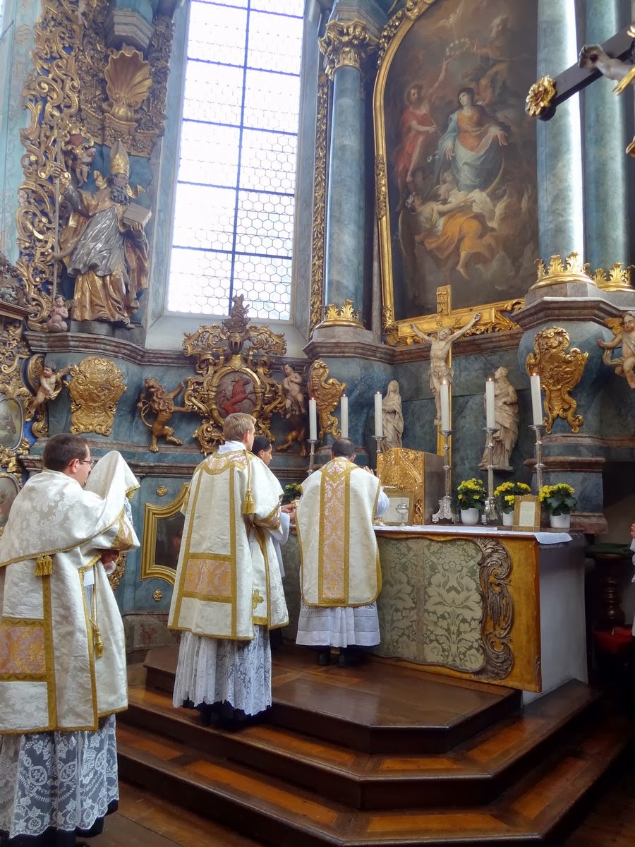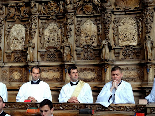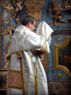C'est le Recteur, M. l'abbé Patrick du Faÿ de Choisinet, qui officiait, entouré de l'abbé Olivier de Nedde comme diacre et de l'abbé Thibault Paris comme sous-diacre. Tous deux venaient de rentrer des Etats-Unis, au terme de leur mois d'échange avec notre séminaire de Denton dans le Nebraska.
