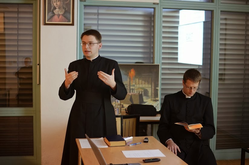 Ainsi avons-nous assisté cette année à un échange "courtois mais franc" opposant des séminaristes d'Angleterre et de Russie d'un côté, et des Républiques dominicaine et tchèque de l'autre, sur le thème : "Utrum re-aedificatio templi hierosolymitani significet finem mundi... an non ? ", c'est-à-dire : "la ré-édification du Temple de Jérusalem signifie-t-elle la fin du monde... ou pas ?". La conclusion revenait logiquement à un fils de St Dominique, le P. Rodrigo Kahl op, professeur de liturgie pour la section du séminaire.