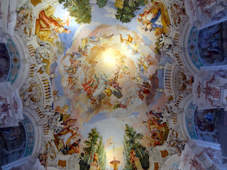La voûte de la nef célèbre la gloire de Notre Dame. La fresque et les stucs se mélangent habilement, et les balcons évoquent le théâtre : le chrétien est invité aux premières loges du spectacle. Dans cet art qu'on a pu qualifié d'"outrageusement catholique", la Contre-Réforme réplique intelligemment à l'austérité luthérienne. Tout dans l'Eglise catholique (et dans ses églises) manifeste la joie du salut. Pas de vitraux, seulement de larges verrières : la lumière entre à flot, car le Ciel rencontre la terre. Le paysan souabe, probablement éberlué en entrant pour la première fois dans ce joyau, avait de quoi s'y distraire quand le sermon l'ennuyait...