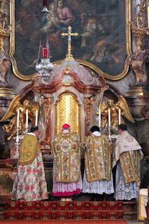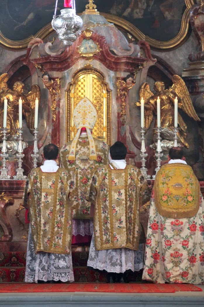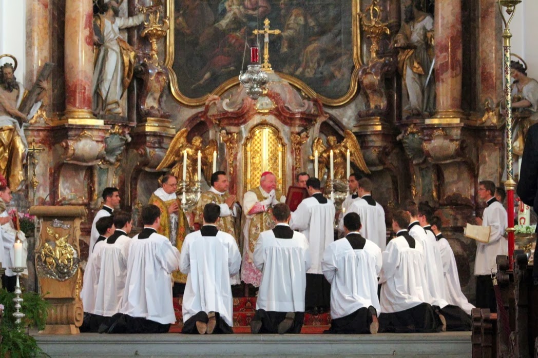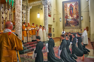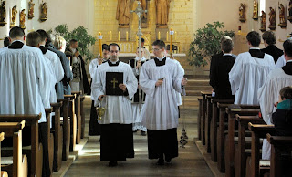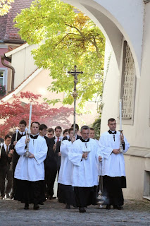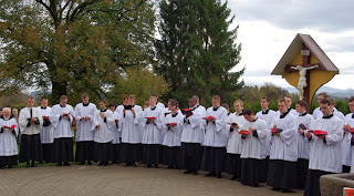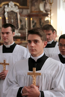 Nos diacres ont pu assister, le 19 octobre, à la cérémonie de tonsure et prise de soutane de douze de nos confrères anglophones, dans la magnifique chapelle du séminaire, si enviée à Wigratzbad... Le séminaire est dédiée à Notre Dame de Guadalupe, patronne des Amériques, comme le montre le grand tableau qui surplombe l'autel latéral côté épître.