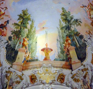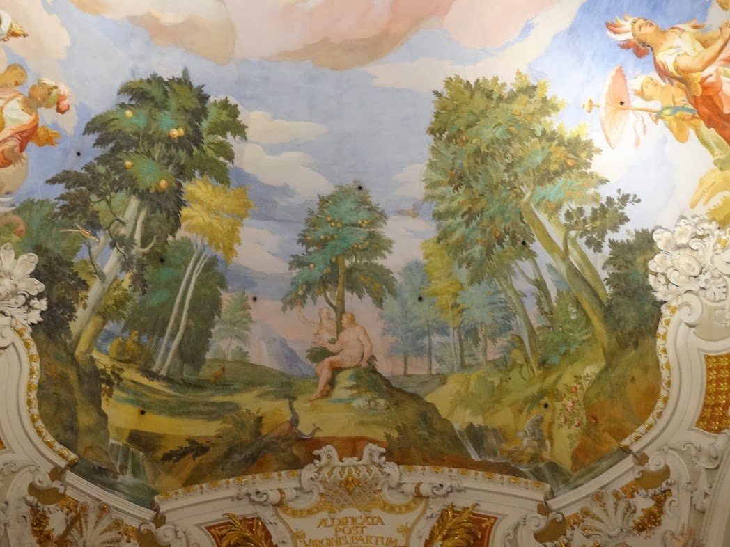 Pour la fête de l'Assomption, il suffit de lever les yeux : deux beaux jardins se font face aux bords opposés de la voûte. Du côté de l'entrée, on contemple le jardin d'Eden, avec Adam et Eve au moment du péché originel. La nature de ce péché est symbolisée par les deux paons du premier plan. L'orgueil de nos premiers parents va être racheté par l'Incarnation rédemptrice, qui implique la kénose du Christ. Elle-même est réalisée grâce à l'humilité de la Vierge Marie, symbolisée ici par la fontaine de l'autre jardin, celui qui donne sur le choeur de l'église. On lit sur le cartouche l'inscription : "hortus conclusus, fons signatus". Cet extrait du Cantique des cantiques (Ct 4,12) est traditionnellement appliqué à Notre Dame pour évoquer sa virginité perpétuelle : "Jardin enclos, fontaine scellée". L'eau est le symbole de la grâce : son abondance signifie la plénitude de grâce de la Mère de Dieu. Depuis la fontaine, l'eau s'élève donc vers le ciel, puis déborde sur le monde, alors qu'au jardin d'Eden elle coule au sol, en s'éloignant des pécheurs...