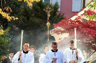 L'abbé Vincent Ribeton, supérieur du district de France, était le célébrant, assisté comme diacre de l'abbé Sébastien Dufour, directeur de l'Institut de la Croix des Vents - St Joseph à Sées dans l'Orne.