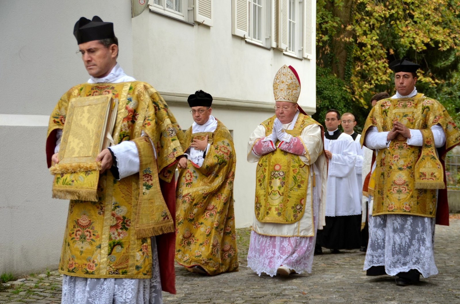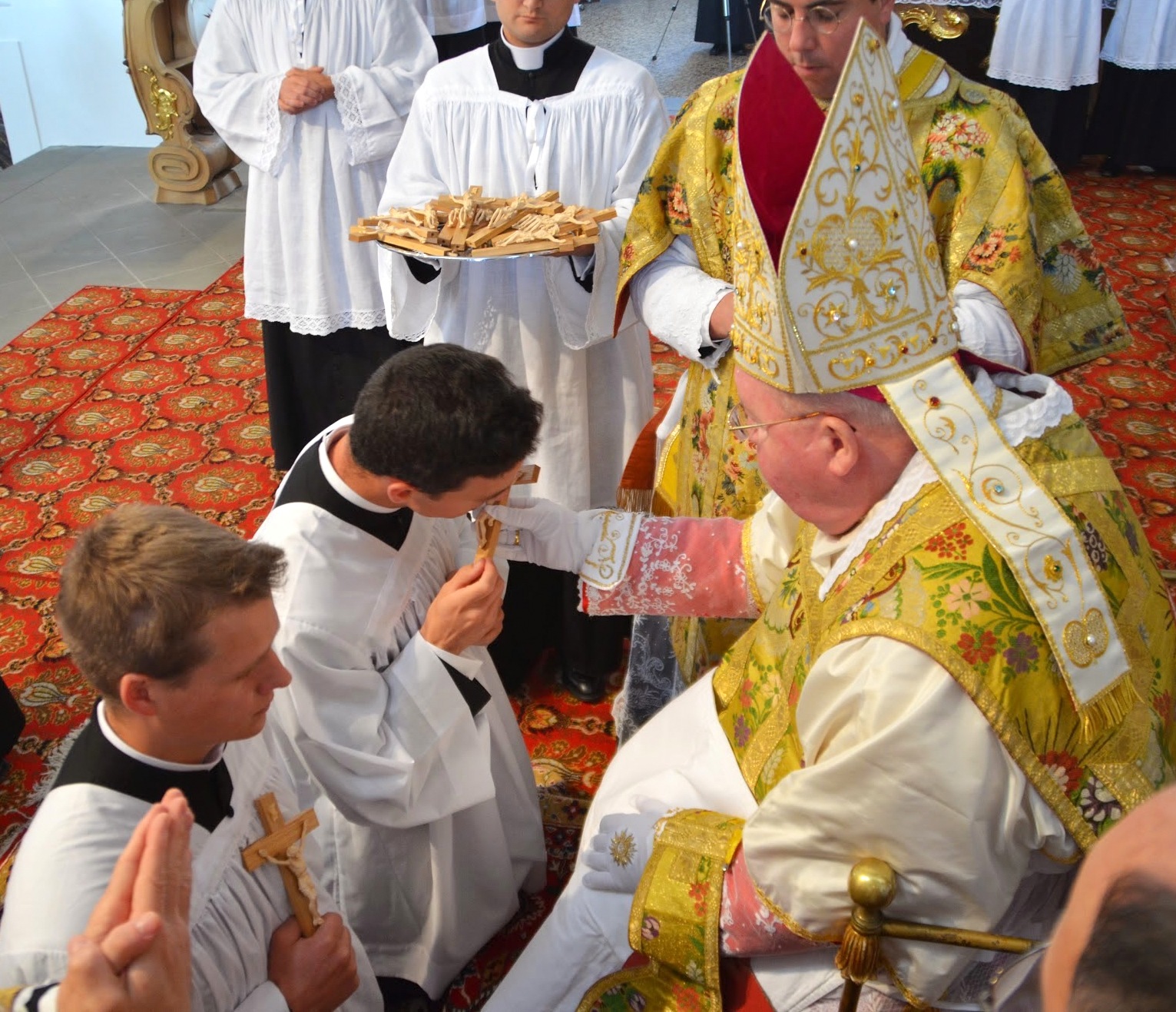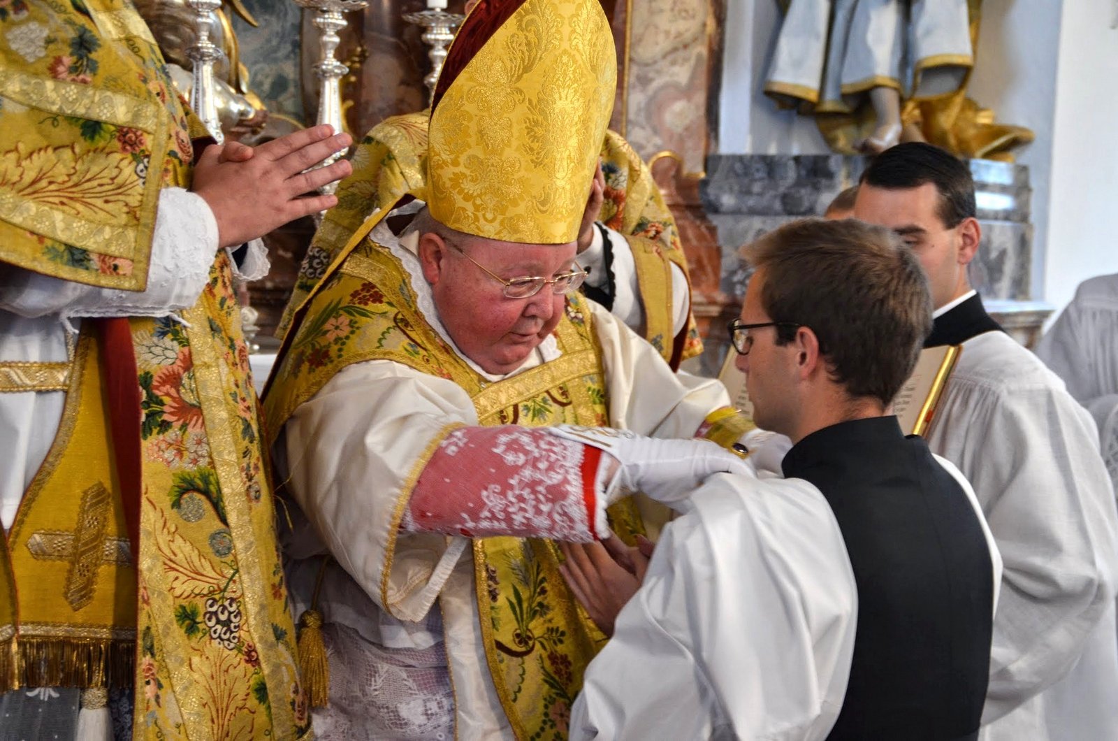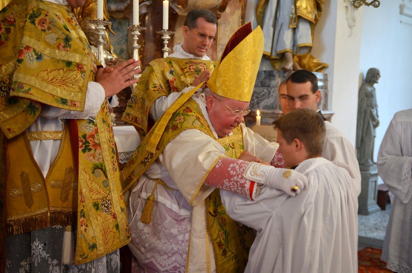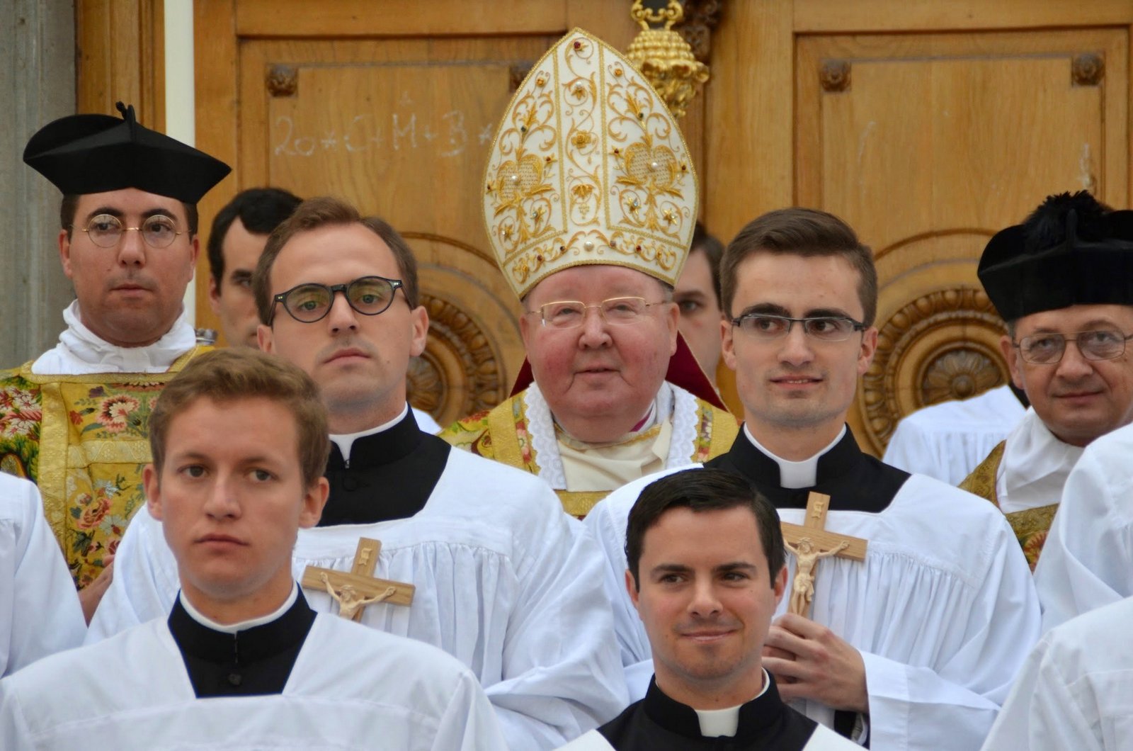 Grand ami de la Fraternité Saint-Pierre, et notre voisin puisqu'il est l'archevêque de Vaduz au Liechtenstein, Mgr Wolfgang Haas a célébré avec gravité et maîtrise, visiblement ému comme nous tous devant nos jeunes lévites : onze francophones (dix Français et un Italien) et sept germanophones (quatre Allemands, deux Polonais et un Autrichien).