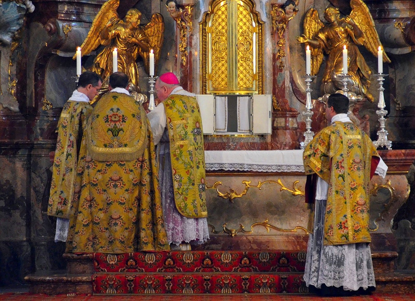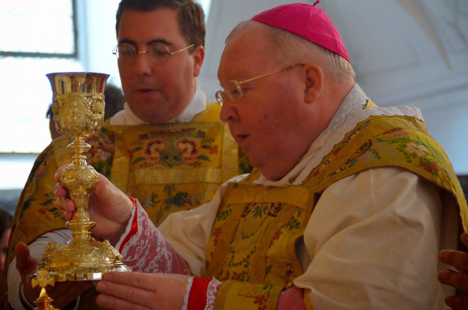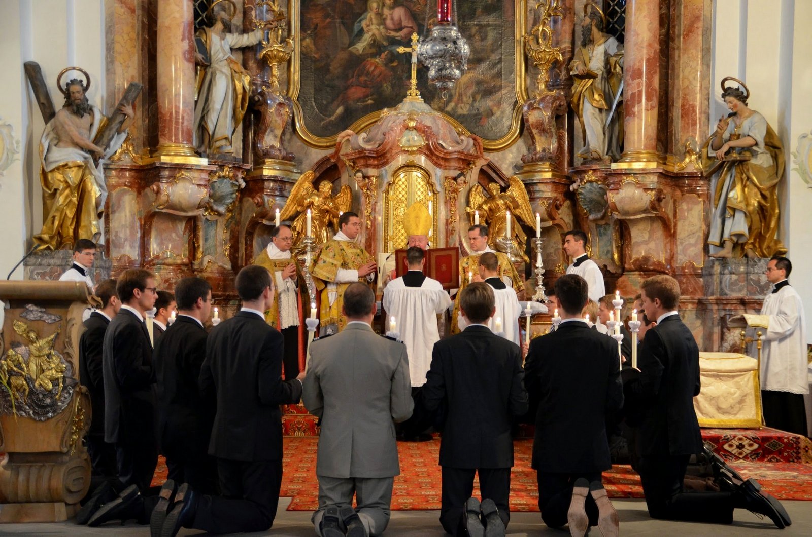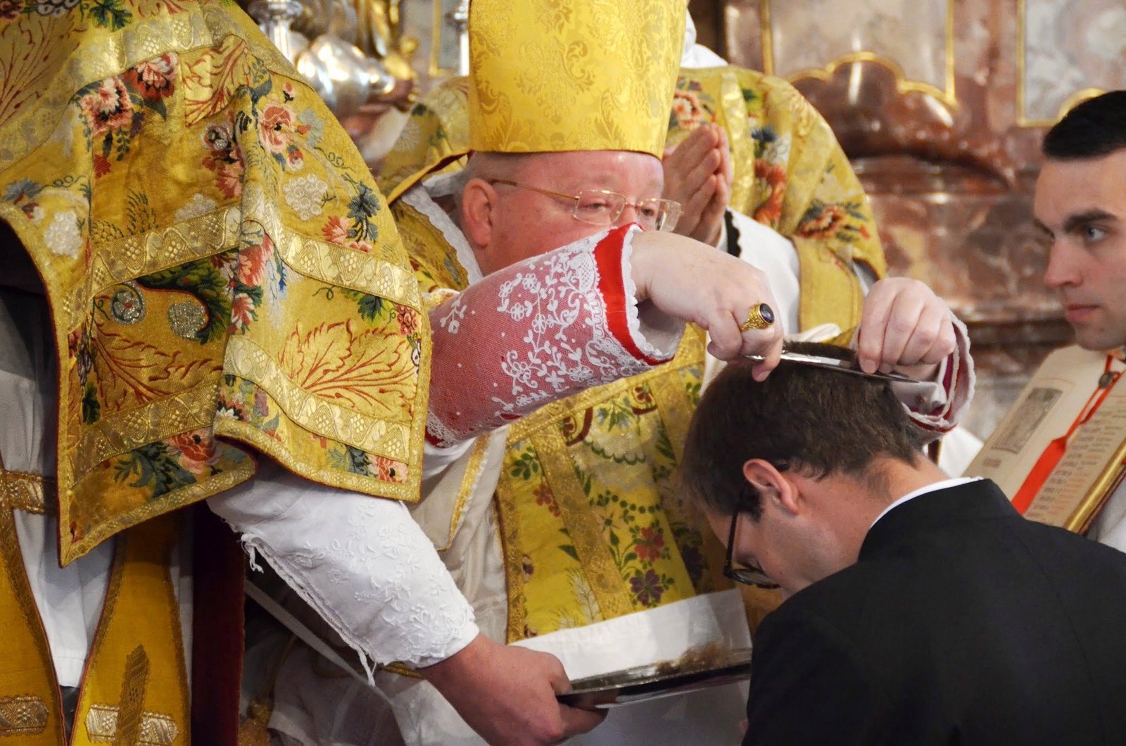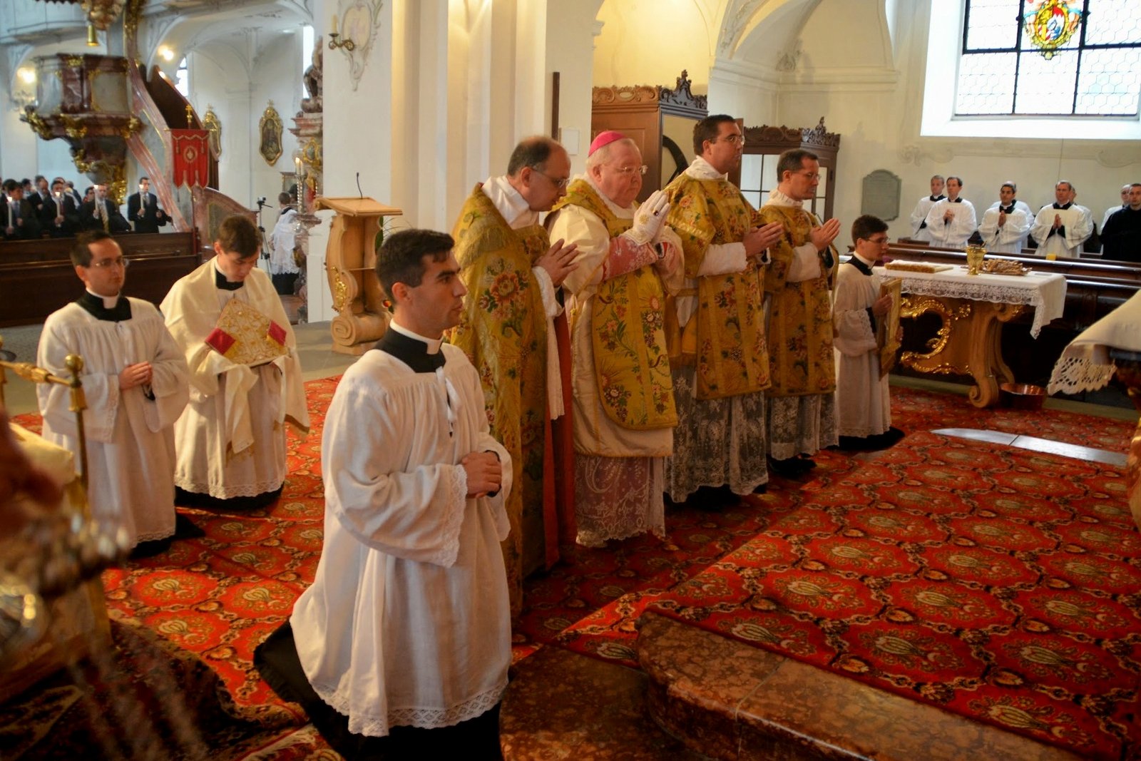 Grand ami de la Fraternité Saint-Pierre, et notre voisin puisqu'il est l'archevêque de Vaduz au Liechtenstein, Mgr Wolfgang Haas a célébré avec gravité et maîtrise, visiblement ému comme nous tous devant nos jeunes lévites : onze francophones (dix Français et un Italien) et sept germanophones (quatre Allemands, deux Polonais et un Autrichien).
